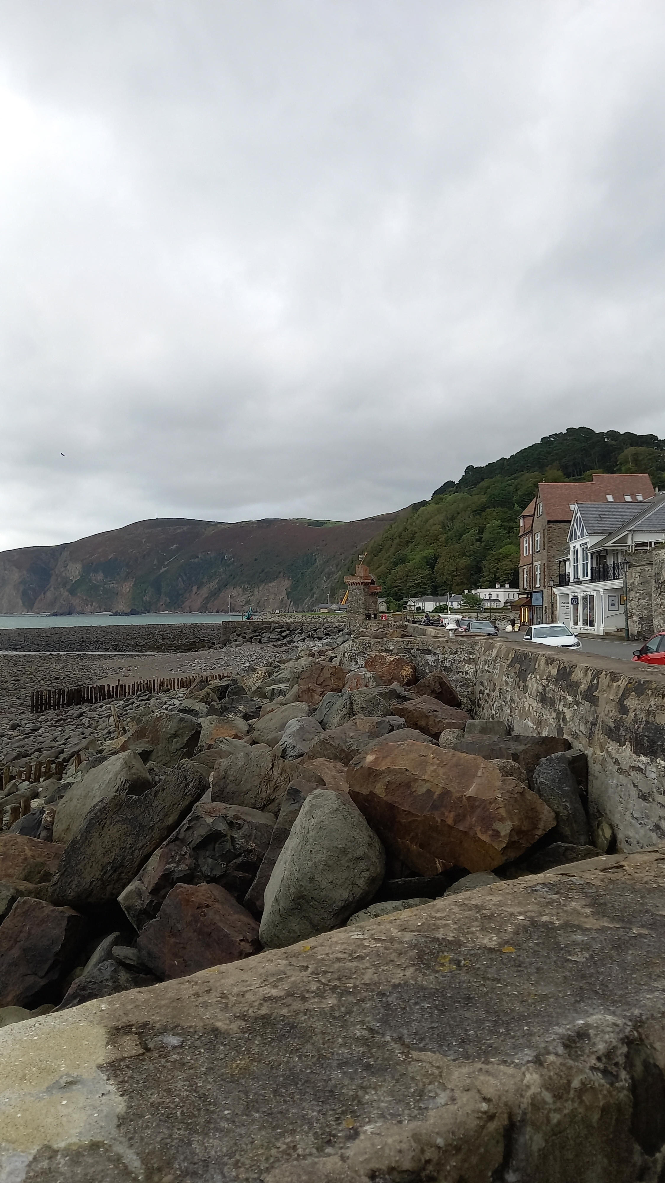 Stopped off at Lynton (top) and Lynmouth (bottom) We walked down to the harbour and came back by the Funicular Railway, opened in 1890 and is the steepest and highest totally water-powered in the world - worth a visit. On 15-16 Aug 1952 a flood occured taking 34 lives. The 1st photo is the river coming down from the hills. We then motored on through the Valley of the Rocks - lovely scenery